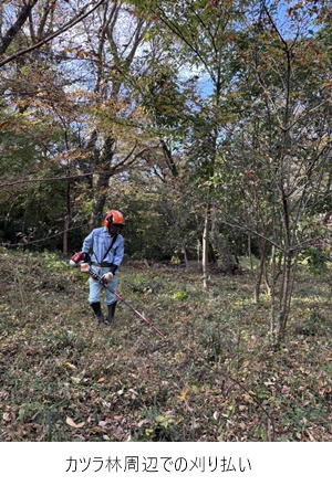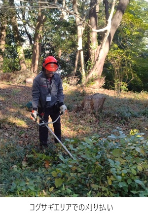 作業内容としては、破損していた桜の植樹支柱の修理を実施したほか、各地区での下草刈り、カツラ林周辺やコグサギエリアにおいて、伸びた下草の刈り払いを行いました。