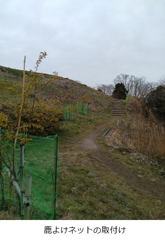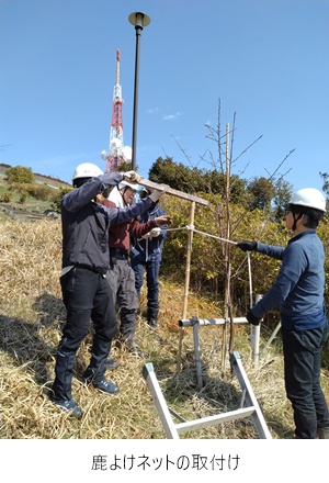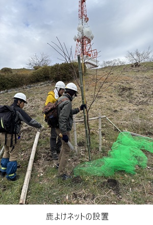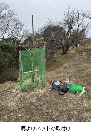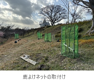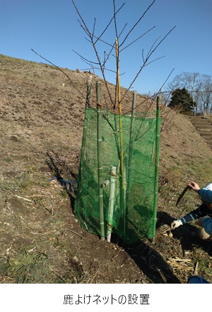 植樹した桜の木の近くで鹿の目撃情報があり、念のため植樹周りに鹿よけのネットを設置しました。