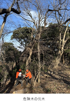 ヤブツバキ地区で落下の恐れがある枯れ枝切断・ササとアオキの駆除など実施しました。