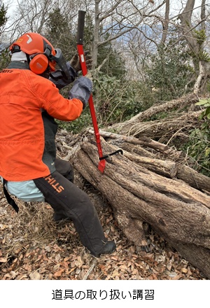 作業内容としては、高枝切りで枯れ枝切断を実施、ハイキング路脇の丸太を玉切りして片づけ、ヤブツバキ間伐、剪定などを行いました。
