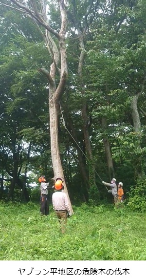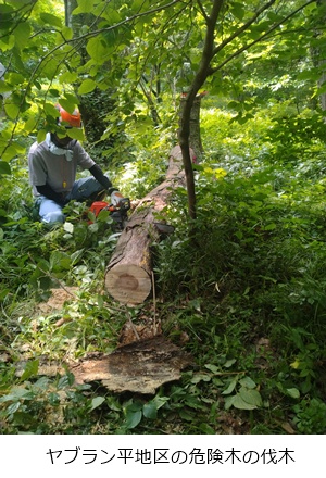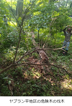 ヤブラン平近くのハイキング路そばにある倒木の危険がある木を伐木・玉切り、片付けを実施しました。