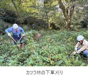 植樹廻りの下草刈り、植樹支柱の補修、下草刈り、クズのツル切りなどを行いました。