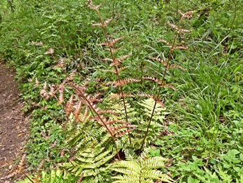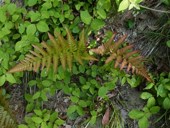 オシダ科 オシダ属 紅羊歯 学名:Dryopteris erythrosora 葉身は2回羽状複葉、やや光沢のある緑色で、先端はしだいに狭まる。 最下羽片の後側第一小羽片は小さい。 羽軸裏に袋状の鱗片が密につく。 葉柄基部に褐色〜黒褐色、全縁の鱗片がつく。 胞子嚢群の包膜が紅紫色を帯びる。 若い葉が紅色を帯びることが名の由来。