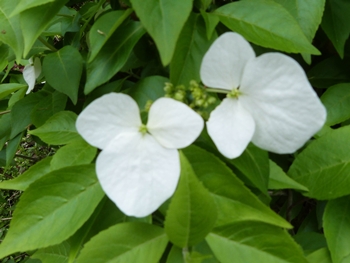 アジサイ科 アジサイ属 額空木 学名:Hydrangea scandens 別名:コンテリギ(紺照り木) 落葉低木。 初夏に枝先に花が集まって咲く。 白い装飾花に囲まれた中心は薄黄色の両性花。 別名のコンテリギは、夏の日差しが強い季節に葉の色が濃いことからつけられたという。
