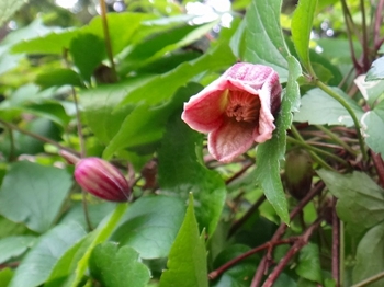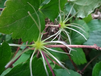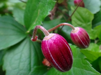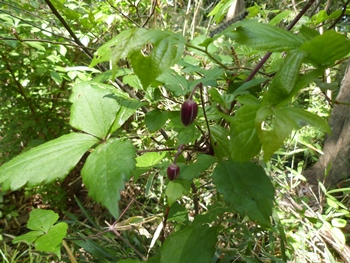 キンポウゲ科 センニンソウ属 半鐘蔓 学名:Clematis japonica つる性低木。 葉は3出複葉で、鋸歯があり、対生する。花は初夏に咲き、外側が暗紅紫色の釣鐘型。 果実は秋に熟し、他のセンニンソウ属と同じように、先端に長い毛がつく。 花の形が半鐘に似ているのが和名の由来。