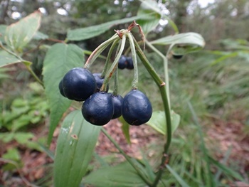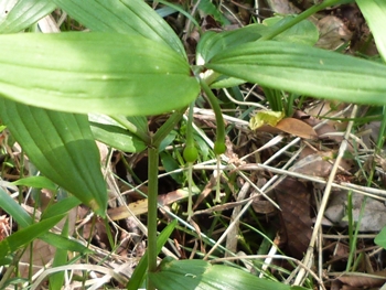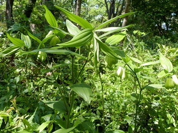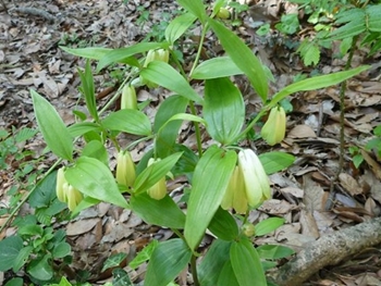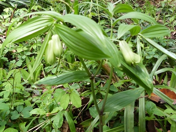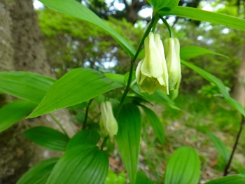 イヌサフラン科 チゴユリ属 宝鐸草 学名:Disporum sessile 多年草。 茎は上部で2つに分かれ、それぞれに、白い筒状の花が下がる。 花の先端は緑色を帯びる。 果実は球形で、熟すと黒くなる。 有毒成分を含む。 山菜として利用されるアマドコロやナルコユリに似ているが、 葉などに悪臭があり、噛むと苦い。 寺院の軒先に吊り下げられる飾りを宝鐸(ほうちゃく、ほうたく)といい、 その形に似ていることから名づけられた。