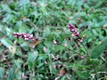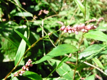 タデ科 タデ属 犬蓼 学名:Persicaria longiseta 別名:アカマンマ 一年草。 葉は楕円形で先端が細くなる。 夏から秋に茎の先端から穂を出し、花を密につける。 花弁は無く、赤く見えるのは蕚。蕚の表面に皺がないのがつぼみで、 実ると皺ができる。 辛味があって料理に使われるヤナギタデに対し、役に立たないのでイヌタデとなったとのこと。