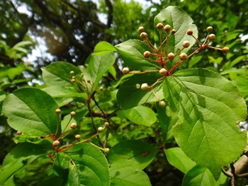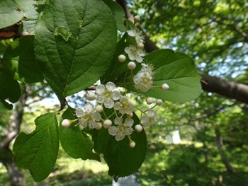 バラ科 カマツカ属 鎌柄 学名:Pourthiaea villosa 別名:ウシゴロシ、 ケナシウシゴロシ 落葉小高木。 長枝と短枝があり、 葉は長枝に互生し、短枝に束生する。 葉の縁に細かく鋭い鋸歯がある。 花は初夏に白く咲く。 果実は秋に熟し、赤くなる。 材が粘り強く、鎌の柄に使われたことが和名の由来。