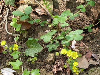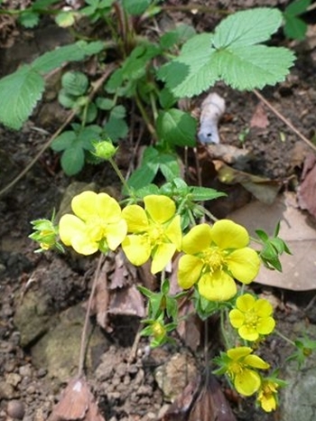 バラ科 キジムシロ属 雉莚、雉蓆 学名:: Potentilla fragarioides var. major 雉が敷く蓆ということからつけられた名前だが、 黄色い花がいくつも集まって咲いている様子は、 いかにも春たけなわの感じがある。 同じころ咲くミツバツチグリと似ているが、 根出葉が奇数羽状複葉で、先端の大きな三小葉に続いて 小さい葉があるのに気付くと、見分けやすい。