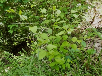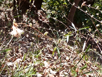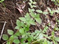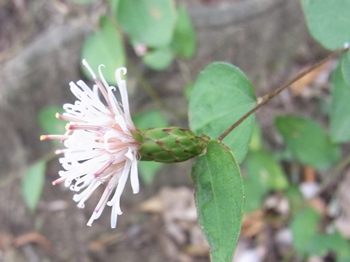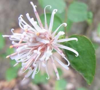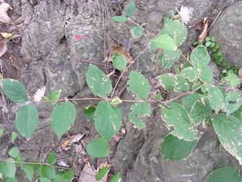 キク科 コウヤボウキ属 高野箒 学名:Pertya scandens 落葉低木。 1年目の茎には葉が互生する。2年目の茎では、 1年目に葉がついていた場所に数枚の葉が出るので、 別の植物のように見える。 花は1年目の枝の先に、 白〜淡紅色の小花が集まって咲く。 高野山で枝を束ねて箒の材料としたのでこの名がある。 正倉院御物の「子日目利箒(ねのひのめとぎほうき)」は、 コウヤボウキの枝に玉を飾ったもの。