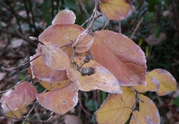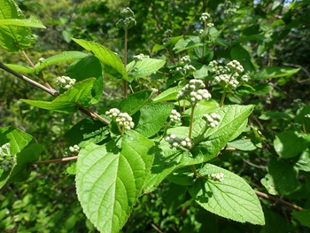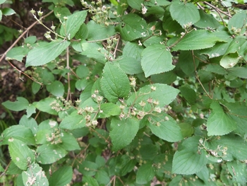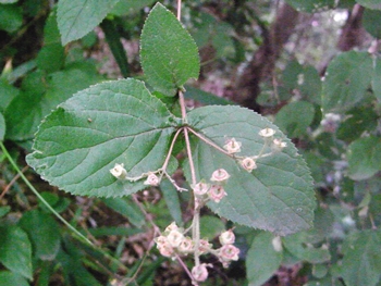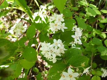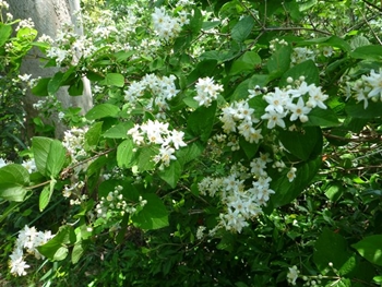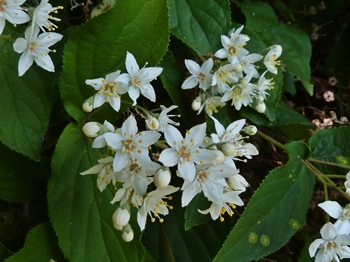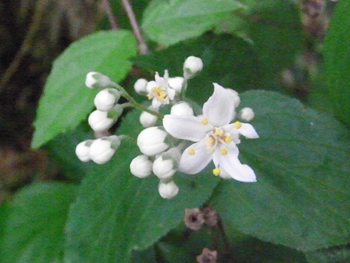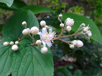 アジサイ科 ウツギ属 丸葉空木 学名:Deutzia scabra 落葉低木。 葉は対生し、葉身は卵形で、両面ともざらつく。 小さい花が初夏に咲く。 花序のすぐ下の葉は、葉柄がなく、茎を抱く。 花の後にできる果実は、花柱がたって、ロウソク立てのように見える。 秋の紅葉も美しい。 和名は、葉が丸く、茎が中空という意味。