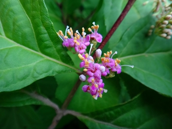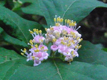 花は集散花序で、淡紫色。花冠は筒状で、香りがある。