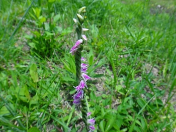 ラン科 ネジバナ属 捩花 学名:Spiranthes sinensis var. amoena 湿っていて日当たりの良い、背の低い草地に良く生育する。 花色は通常桃色で、小さな花を多数細長い花茎に密着させるようにつけるが、その花が花茎の周りに螺旋状に並んで咲く「ねじれた花序」が和名の由来である