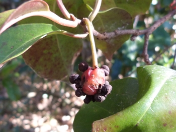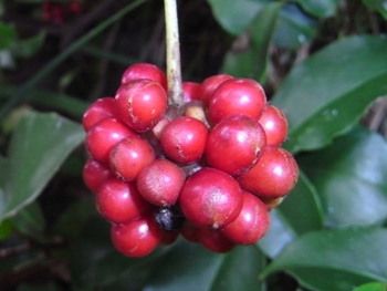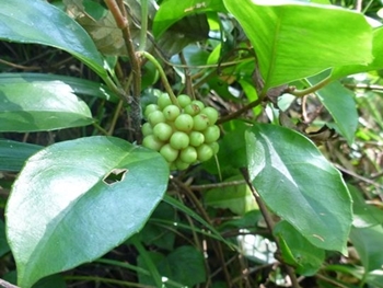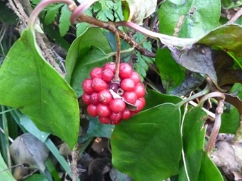 マツブサ科 サネカズラ属 実葛 学名:Kadsura japonica 別名:ビナンカズラ(美男葛) 常緑つる性木本。ふつう雌雄異株。 葉は艶があり、互生する。 夏に淡黄色の花が咲く。 雌花が結実すると、赤い実が集まった集合果 をつくる。 蔓からとれる粘液を整髪料にしたのでビナンカズラの名ができた。 実は生薬になる。