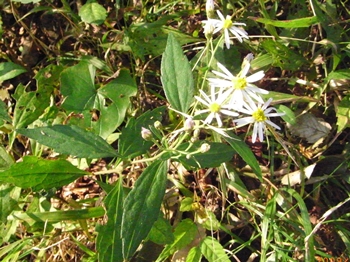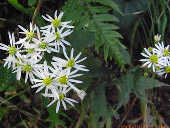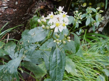 キク科 シオン属 白嫁菜 学名:Aster ageratoides var. ageratoides 多年草。 野菊の仲間。 葉は互生し、三行脈があり、縁に大きな鋸歯がある。 シオン属はヨメナ属に比べ冠毛が長い。 シロヨメナは名前がヨメナだが、シオン属で冠毛が目立つ。