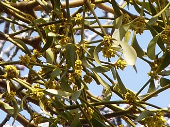 ビャクダン科 ヤドリギ属 宿木・寄生木 学名:Viscum album subsp. coloratum 常緑低木。 落葉広葉樹の上に寄生するので、ヤドリギと名付けられた。 高い木の上に生えることが多く、気づきにくいが、 湘南の森では新顔の植物である。 葉は対生、やや厚みがある。雌雄異株で、写真のものは雄花が見える。 雌花にできる実の果肉は粘りがあり、鳥に食べられた後、 樹に粘りつき 樹上で発芽する。